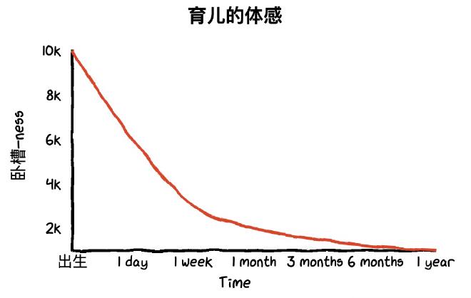 我看的育儿书一般会写几个月大的时候该如何如何,但很少有看到第一周应该怎么做的。事实上产后随着时间的流逝,育儿的体感变化在初期是非常剧烈的,后期渐渐稳定下来,大概像这样: