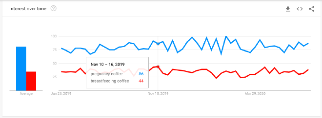 这又是一个人和人之间传来传去很玄乎的问题。不过好在,哺乳期间能不能吃 xx 这个问题,比怀孕期间能不能吃 xx 的问题关注度小多了。哺乳喝咖啡的关注度基本上是怀孕喝咖啡的一半: