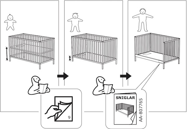 和 Toddler 生活在一起,并不容易觉察其每天的变化,往往只是在要买大一号的衣服或鞋子的时候才意识到 Toddler 又长高了。另一个参照物是 crib。当初购买的 SNIGLAR crib 宣称是三合一(有三种形态,如下图所示),后来果然都用到了。一岁又九个月的时候,有一次 Toddler 在床上蹦跶,一个用力过猛就从栅栏上翻了出来(头着地),幸亏无碍。我们意识到是时候将 crib 变为第二形态了——把床板降低。对于我们来说,这也意味着需要把腰弯得更深才能够得着躺在里面的 Toddler。